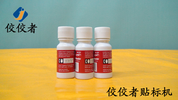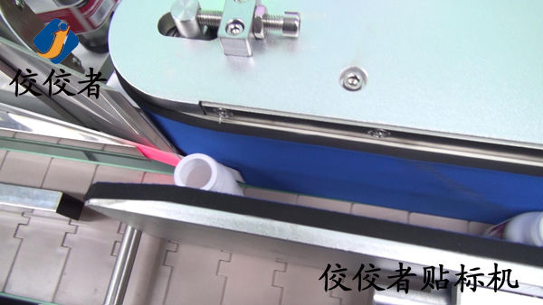 (上圖)接著展示的是剝離的標(biāo)簽正好貼在輸送中的小圓瓶上,同時即將經(jīng)過一端正在運(yùn)行的覆標(biāo)海棉通道,覆標(biāo)完成貼標(biāo)過程看似只有一秒鐘的時間,在這個時間中,機(jī)器進(jìn)行了一系列的工作:測物電眼檢測到小圓瓶時,回饋一個信號給PLC,PLC再發(fā)出出標(biāo)信號,標(biāo)簽繼續(xù)剝離時貼在經(jīng)過的小圓瓶上,小圓瓶再經(jīng)過覆標(biāo)機(jī)構(gòu).至此,貼標(biāo)過程就已經(jīng)完成了. (操作過程:放產(chǎn)品—>分瓶(設(shè)備自動實現(xiàn))—>貼標(biāo)并覆標(biāo)(設(shè)備自動實現(xiàn))—>貼標(biāo)完成。)下圖是貼好標(biāo)簽的產(chǎn)品: