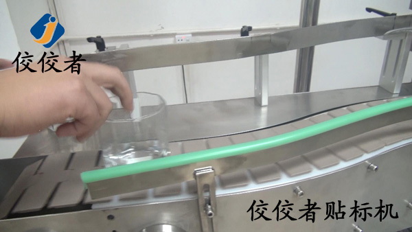 下圖展示的是工作人員將需要貼標(biāo)的玻璃杯放在方便拿取的位置以增加貼標(biāo)的效率,此時有一個步驟在圖片中沒有展示出來,那就是接通電源.之后需要做的就是將玻璃杯放在輸送帶上,.然后調(diào)整好角度,此時貼標(biāo)過程已經(jīng)完成.看似只有一秒鐘的時間,在這個時間中,機(jī)器進(jìn)行了一系列的工作,測物、測標(biāo)、剝標(biāo),側(cè)面貼標(biāo)、下面貼標(biāo),此時貼標(biāo)頭貼標(biāo),到指定位置,.至此,貼標(biāo)過程就已經(jīng)完成了. (操作過程:放產(chǎn)品—>貼標(biāo)并覆標(biāo))—>取出已貼標(biāo)產(chǎn)品。)如下圖。此圖展示為手工放產(chǎn)品,也可以接流水線,所有與產(chǎn)品接觸的地方為塑膠(非金屬),保證產(chǎn)品輸送過程,起到緩沖,減少振動,保證在貼標(biāo)過程中產(chǎn)品合格,玻璃易碎難點(diǎn)。
