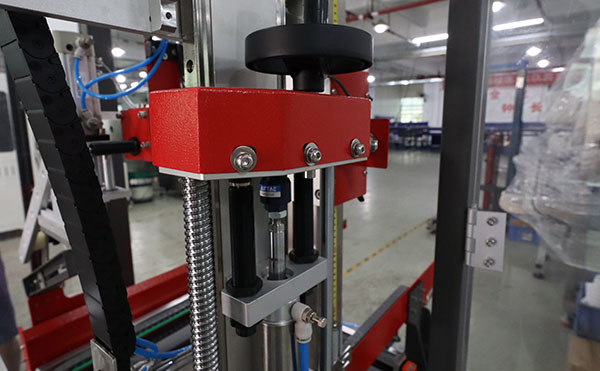 自動折蓋封箱機采用感應式折蓋設計。紙箱進入工位后,設備自動將前后蓋折合平整,隨即完成上下一字封箱。整個過程無需人工干預,操作員只需把裝滿商品的紙箱放上傳送帶即可。