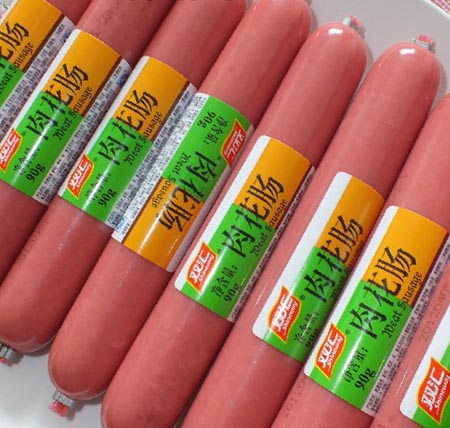 在標題上我說了,還有方形的。現在市場上方形的火腿腸也不少。能貼這個的機器也有。下面來看一下我公司的全自動平面貼標機對 方形火腿腸進行貼標的樣品圖片。
