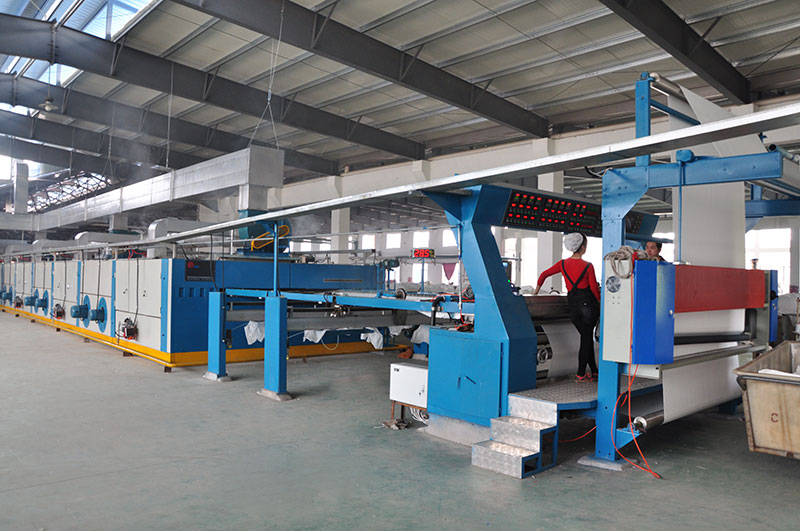 | 工藝流程:平幅進布 → 緊布架 → 上漿 → 軋干 → 上針 →拉幅烘干 → 刷絨 → 脫針 → 落布 |